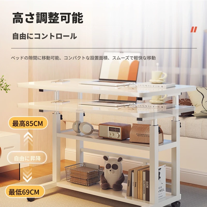 移動式の昇降パソコンデスク|学生向けシンプル学習デスク|寝室にぴったりのベッドサイドテーブル|快適なベッド上学習&作業空間を実現!
