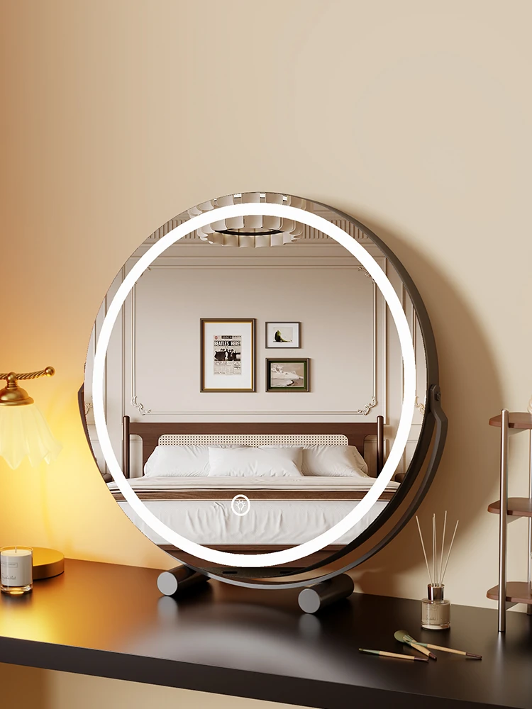 高精細LEDライト付き化粧鏡 - スマートデザインの卓上化粧台用、寝室に最適な大きな円形ミラー。美しさを引き立てるハイビジョン品質で、毎日のメイクアップが楽しくなる!