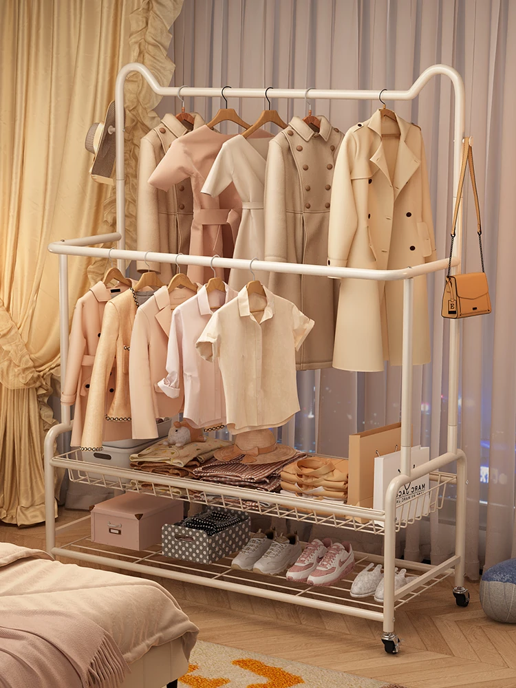 寝室用スタイリッシュなフロアハンガー!クリームカラーのアイアン製、二段式衣類収納ラック。ベッドサイドにぴったりの便利アイテムで、衣類をスマートに整理整頓!おしゃれで機能的な生活を実現します。