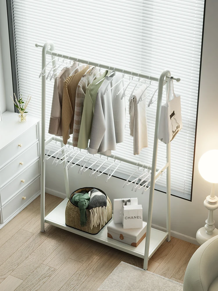 おしゃれな室内用スタンド型コートハンガー - 丈夫なダブルポールデザインで、衣類の収納や干し物に最適!シンプルで使いやすく、あなたの寝室をすっきりと整えます。