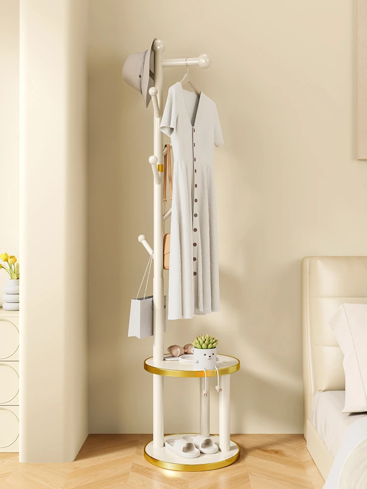 寝室用クリームカラーのスタイリッシュなコートハンガー!玄関やベッドサイドに最適な実木製のフロアスタンド衣類ラックで、日常の整理整頓をお手伝いします。おしゃれで実用的な収納アイテム!